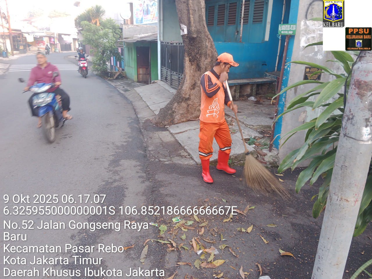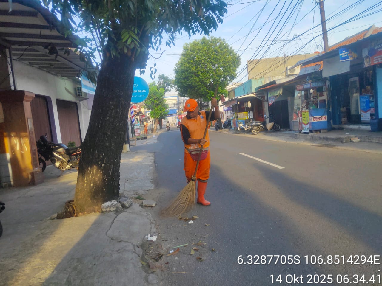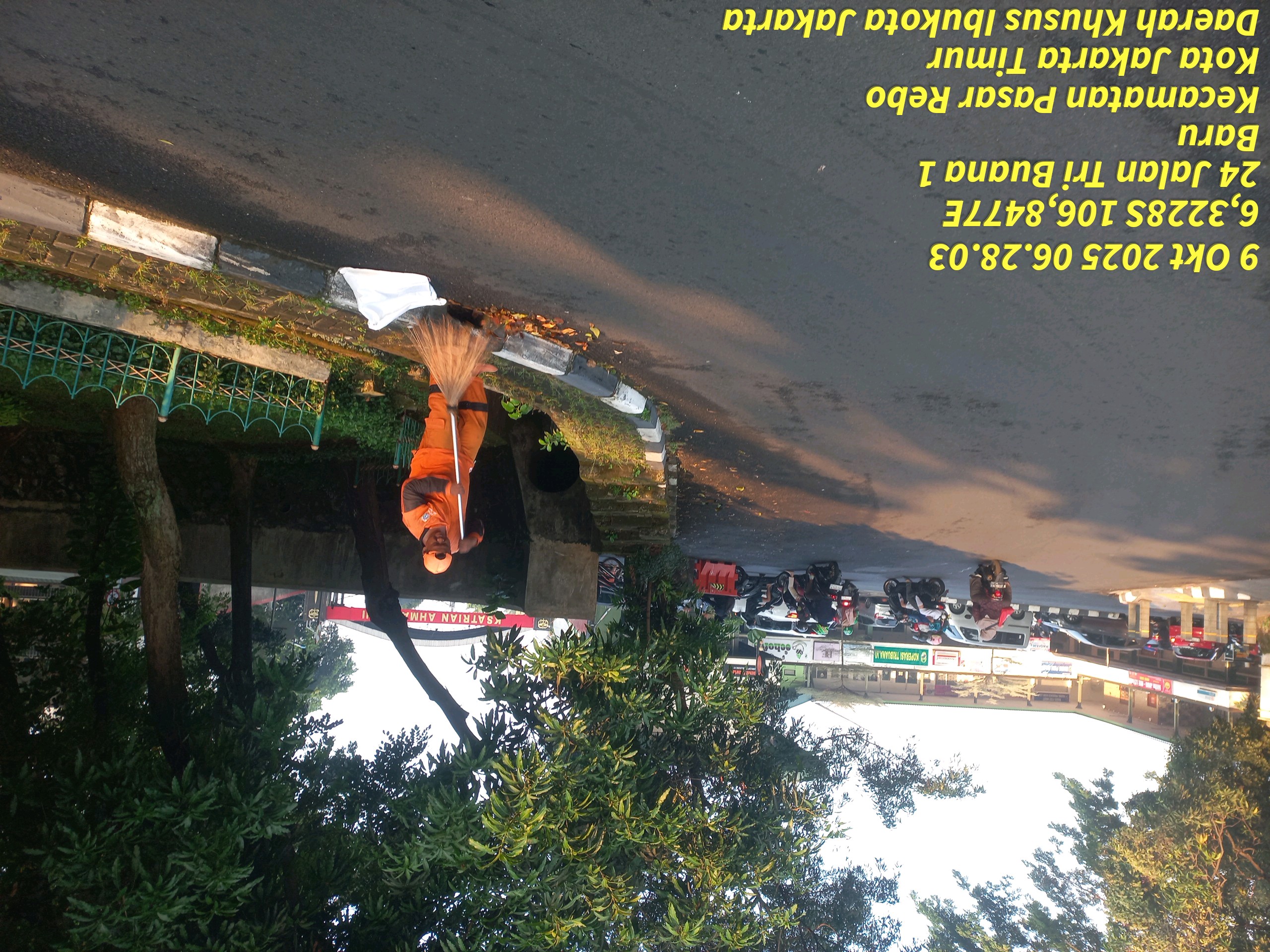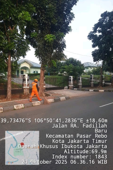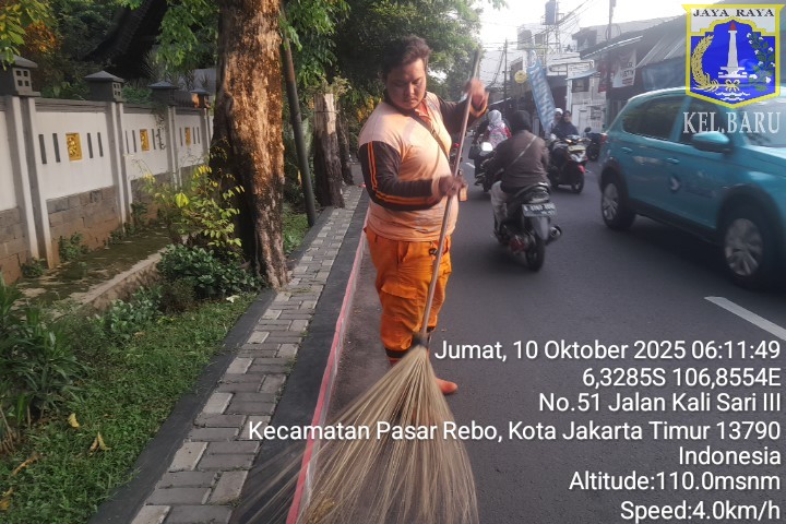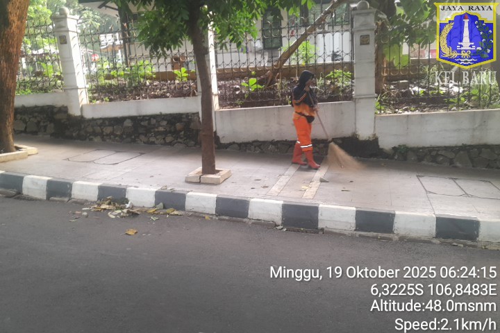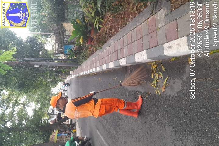 78 | 1 | Jum'at, 10 oktober 2025 | Melakukan penyapuan pagi Jalan protokol | Jl. Kalisari 3 ~ Jl. Gongseng raya serta Jalan Artei (Jl. Aljadid) , RT 002/ RW01 | ![]() |