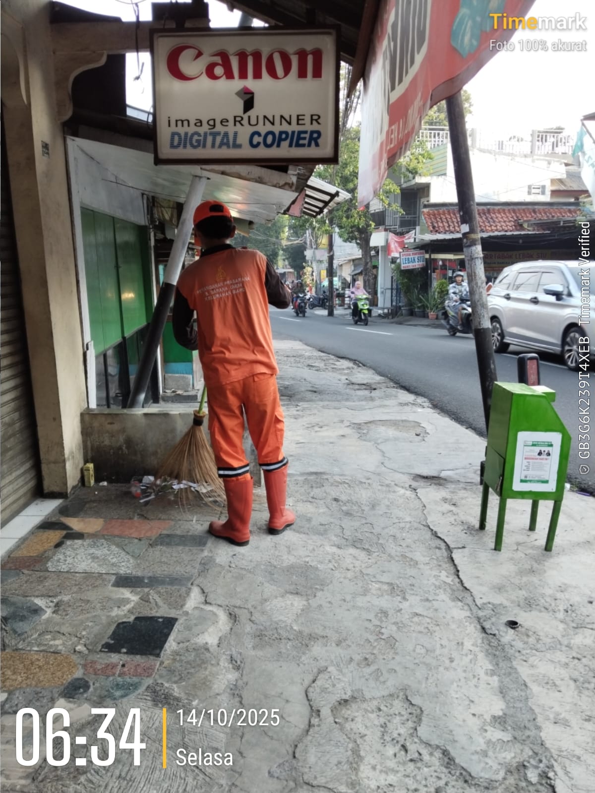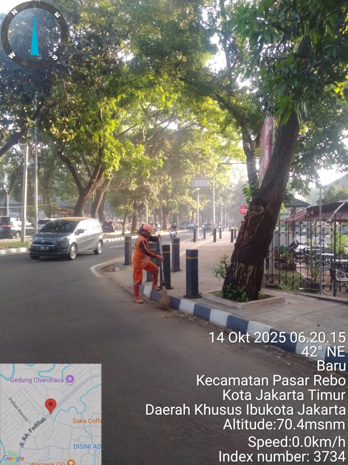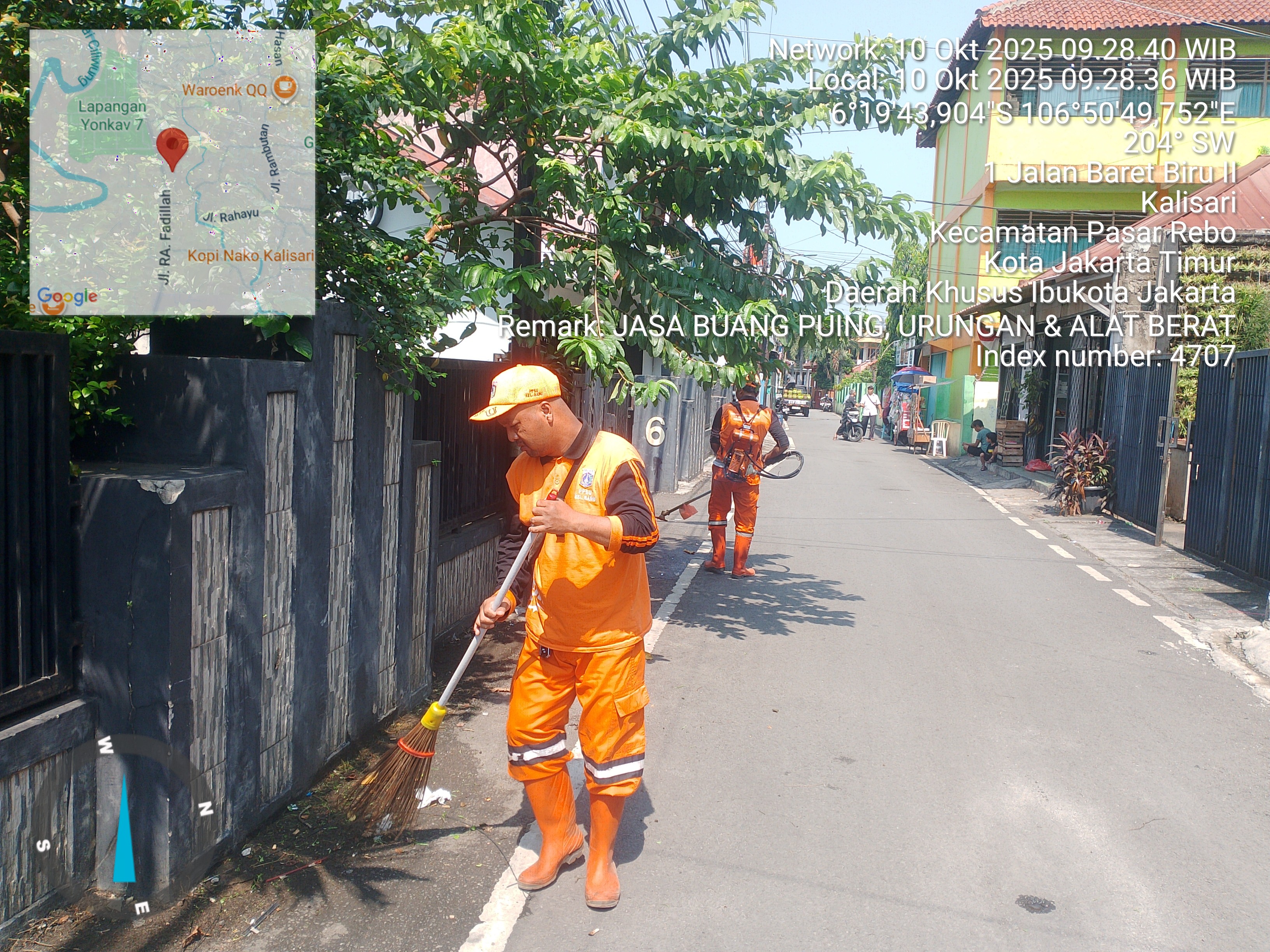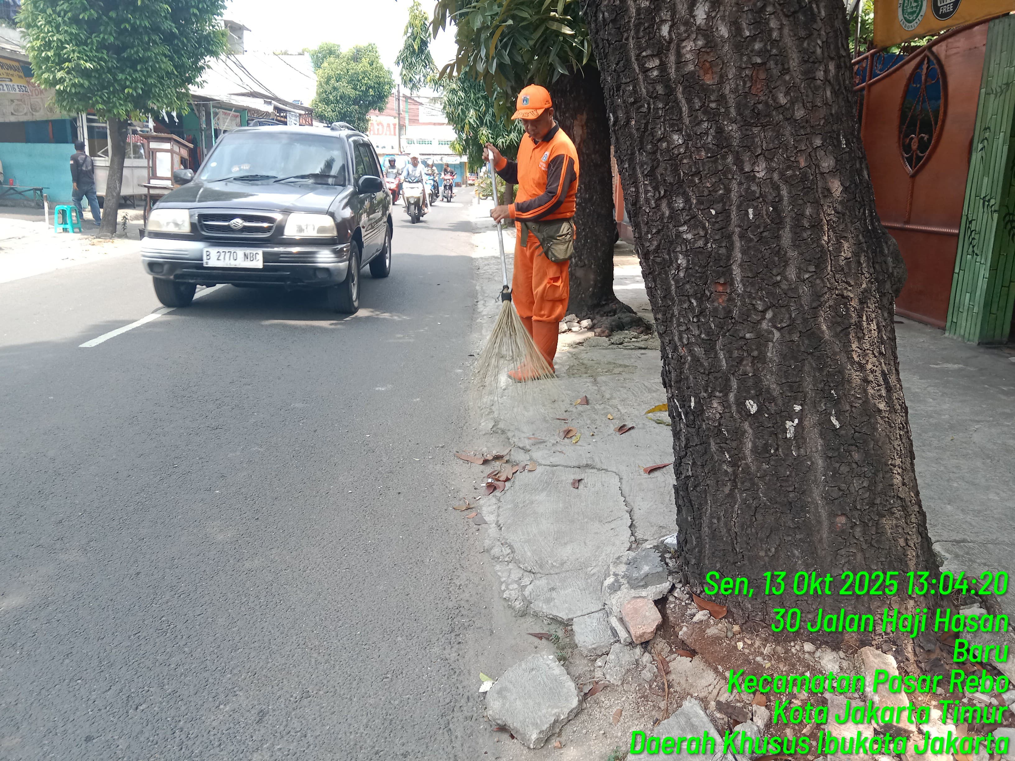 78 | 1 | Jum'at, 10 oktober 2025 | Melakukan penyapuan pagi Jalan protokol | Jl. Kalisari 3 ~ Jl. Gongseng raya serta Jalan Artei (Jl. Aljadid) , RT 002/ RW01 | ![]() |