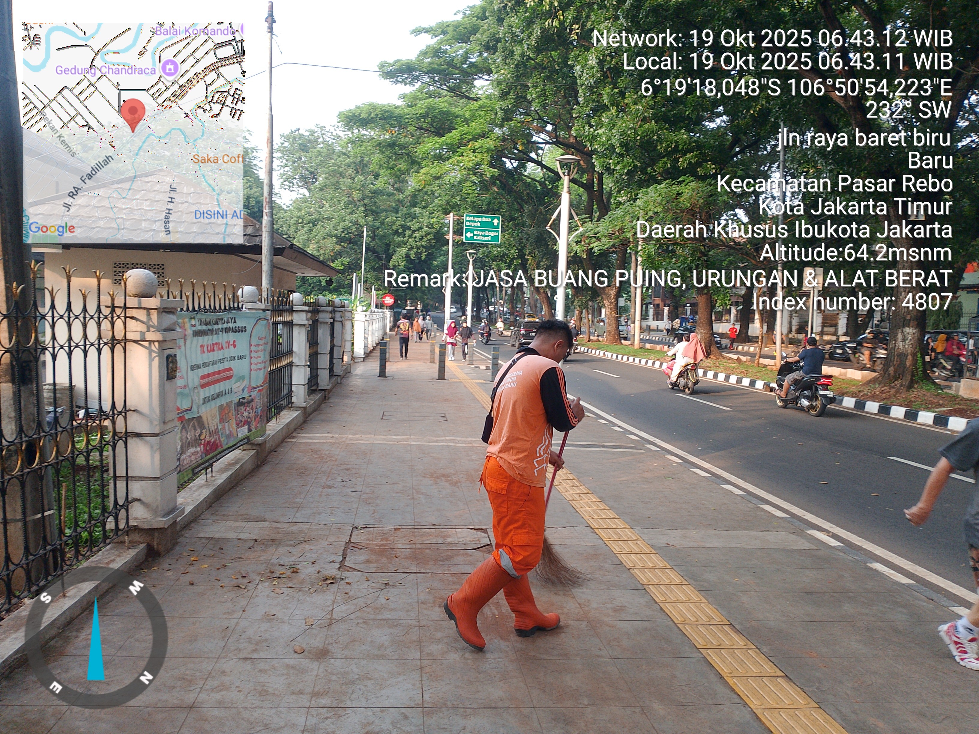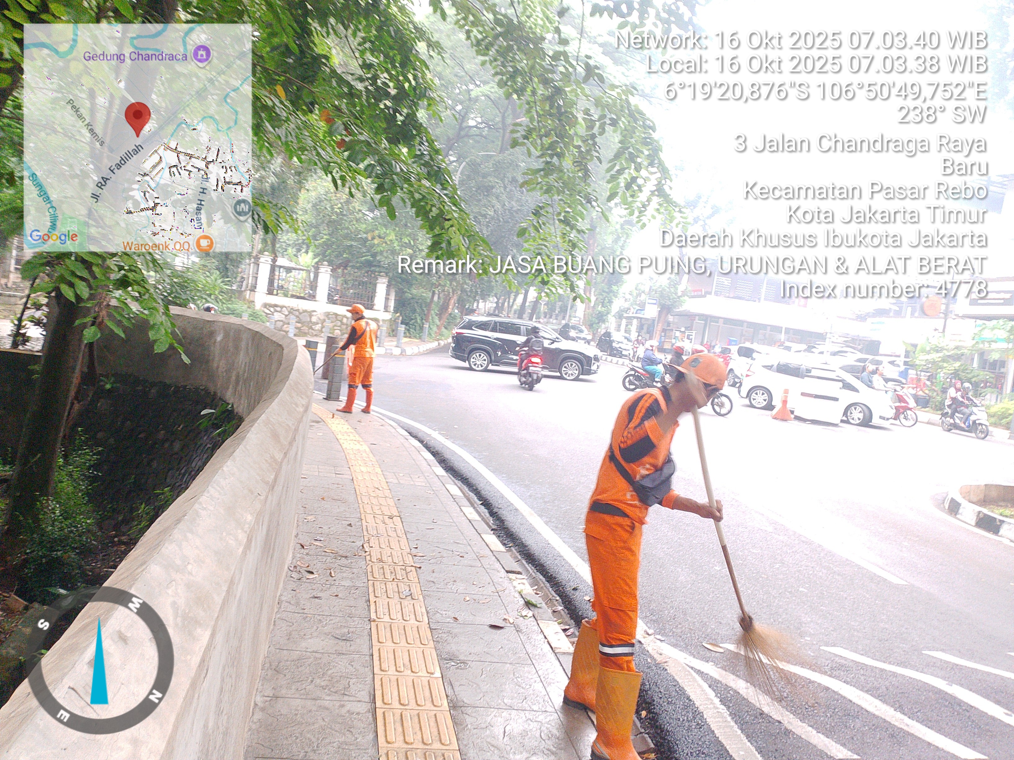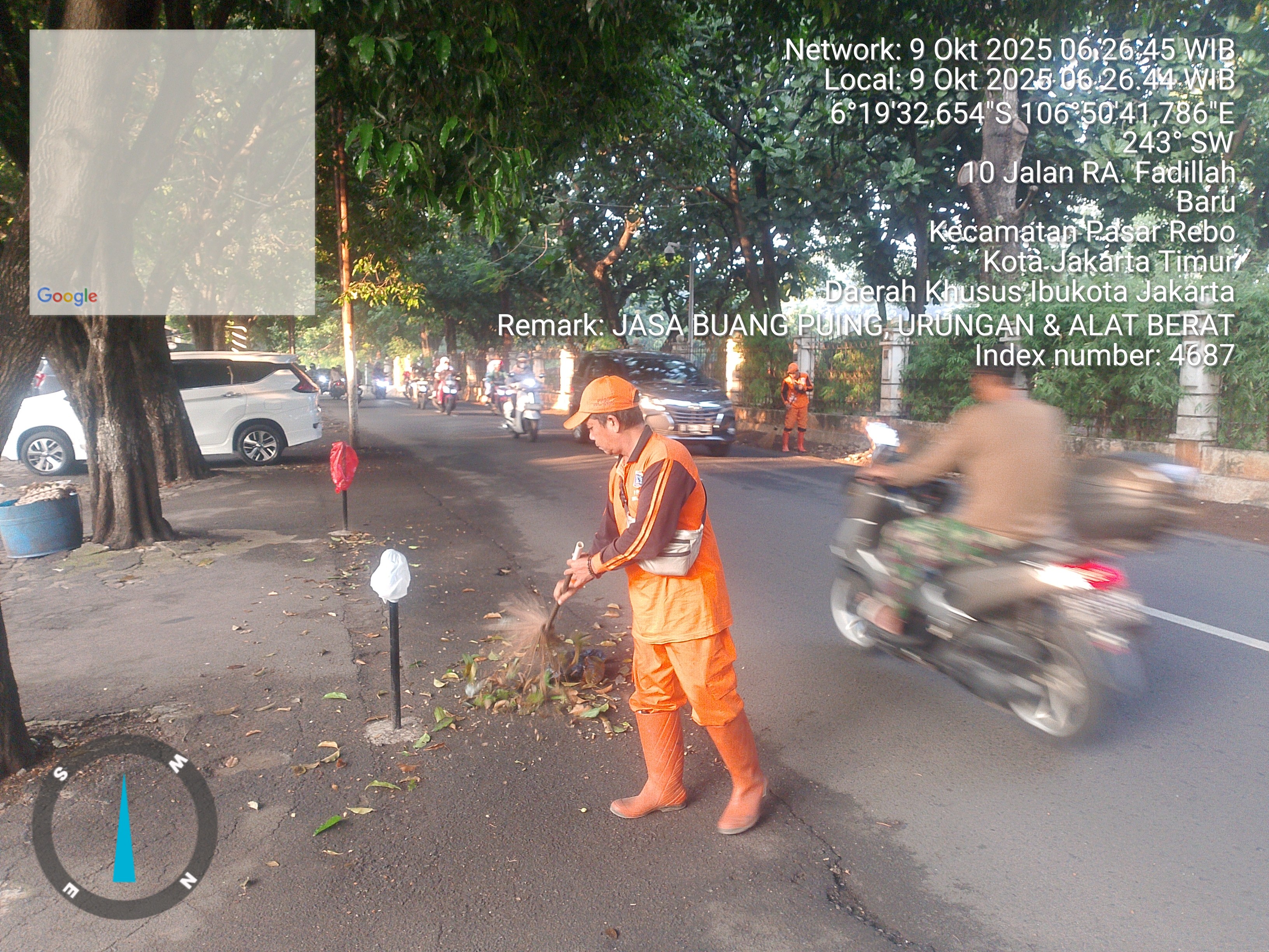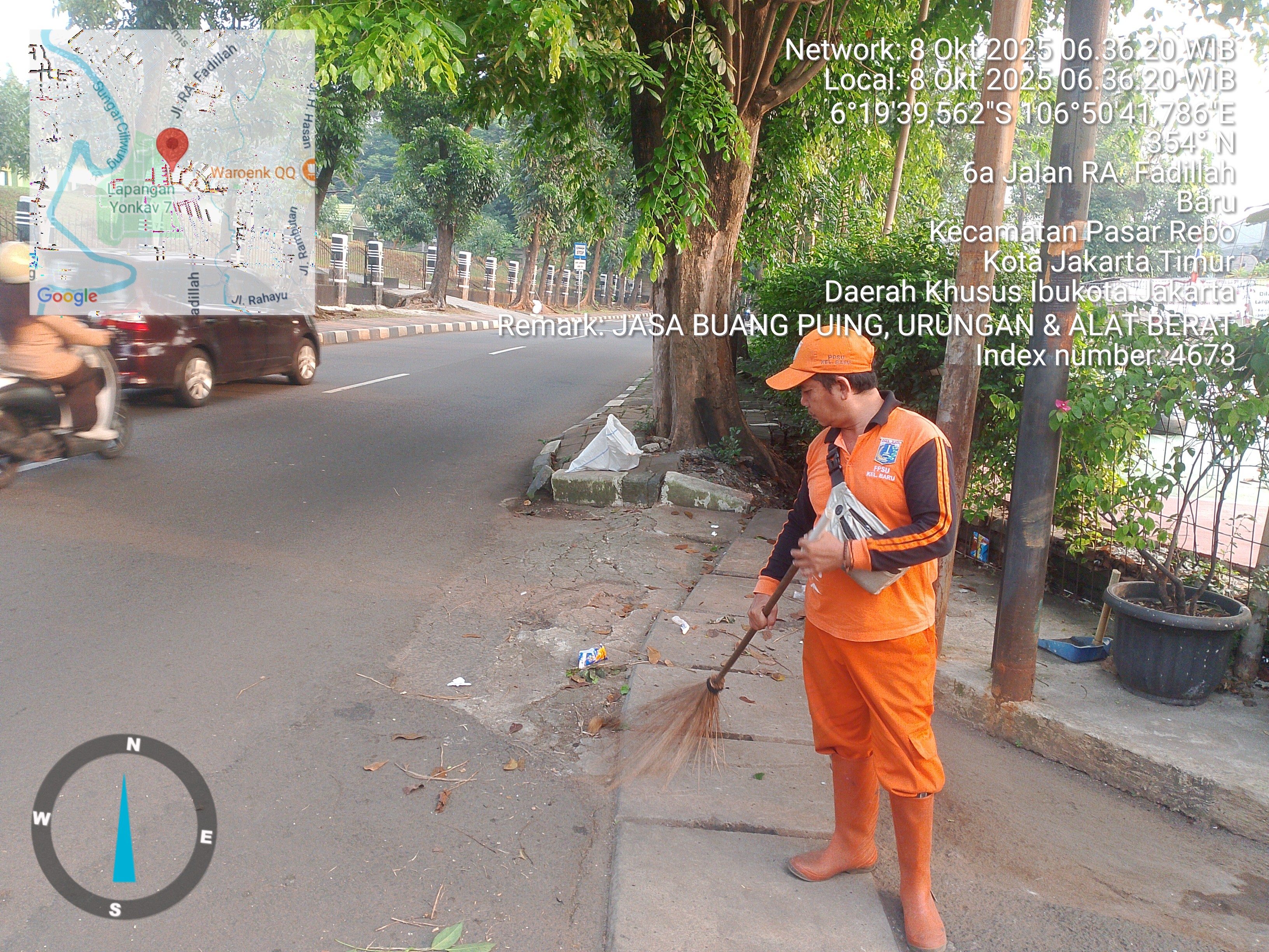 62 | 1 | Senin, 13 oktober 2025 | Melakukan penyapuan pagi Jalan protokol | Jl. Hasan ( moong ~ bstas ) , RT 003/ RW10 | ![]() |