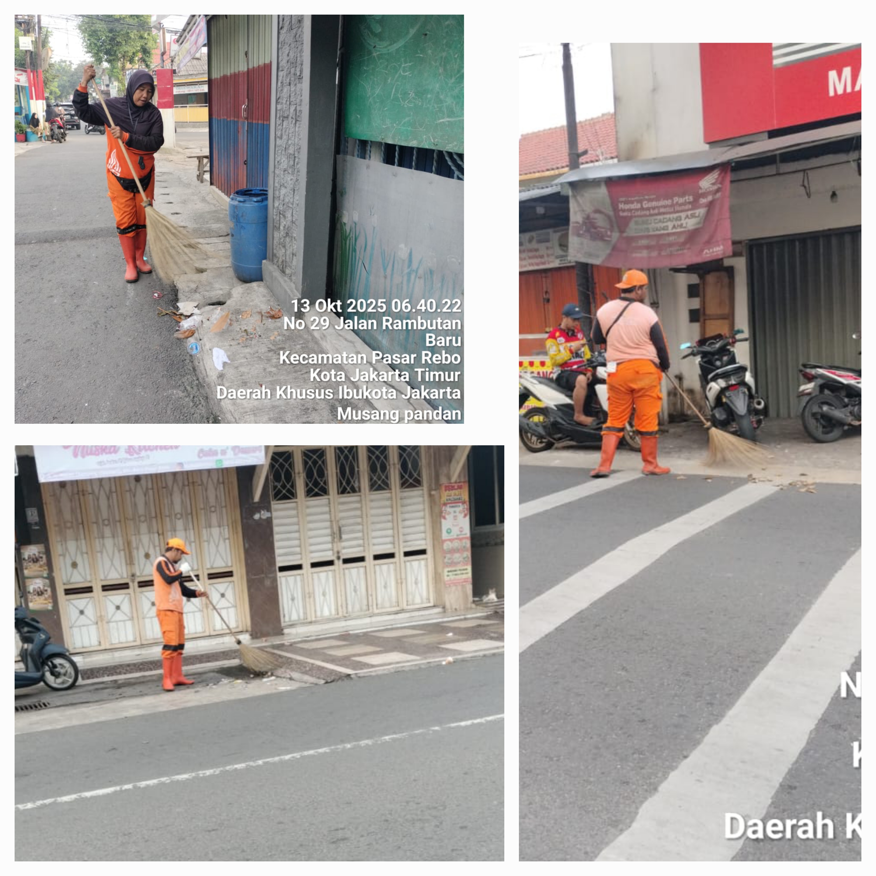 106 | 5 | Selasa, 7 oktober 2025 | Pelakukan penyapuan jalan protokol | Jln batas - jln H.moong , RT 003/ RW10 | ![]() |